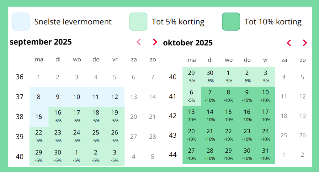 Voor een renovatieproject hadden we de kozijnen pas vijf weken later nodig. Door te kiezen voor +20 werkdagen levertijd, kregen we 10% voordeel en bespaarden we ruim 342,- op onze bestelling.