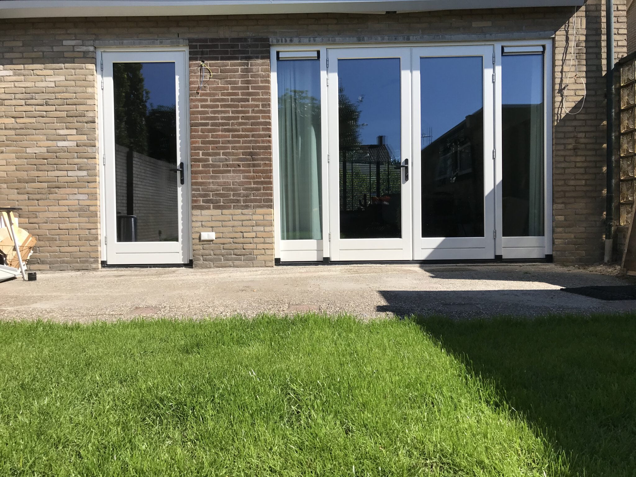 Dit zijn onze houten tuindeuren met twee zijlichten voorzien van een borstwering. Hiermee loopt de glaslijn van de tuindeuren door in de zijlichten. Bijkomend voordeel is dat de borstwering opspattend vuil bij regenval tegenhoud en de ruiten niet zo snel smerig worden.